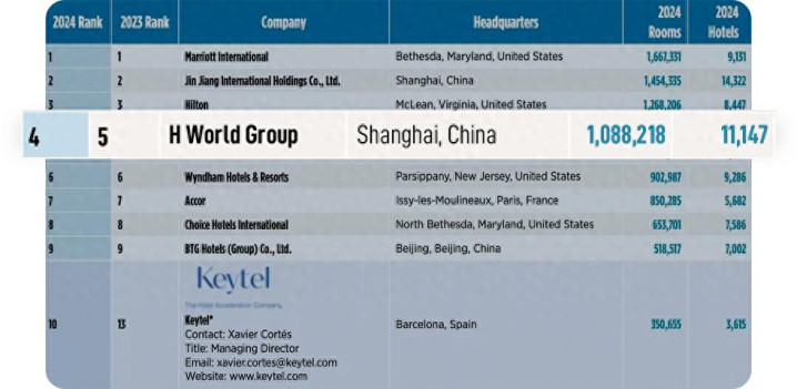 图注:华住集团位列《HOTELS》杂志“2024全球栈房集团205强”榜单第四