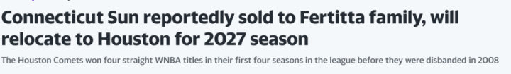 北京时分3月28日,据ESPN记者菲利普报说念,由休斯顿火箭雇主费尔蒂塔领衔的费尔蒂塔眷属已毕契约,以3亿好意思元收购康涅狄格阳光队。这支球队将在本年夏天于康涅狄格打完终末一个赛季后,在2027赛季认真搬迁至休斯顿。