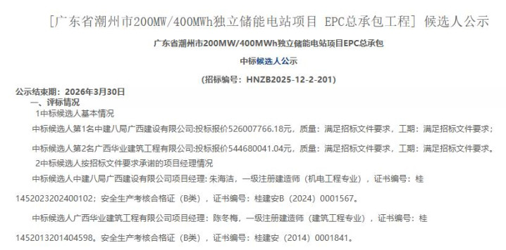 广东省潮州市200MW/400MWh安适储能电站技俩 EPC总承包工程候选东谈主公示