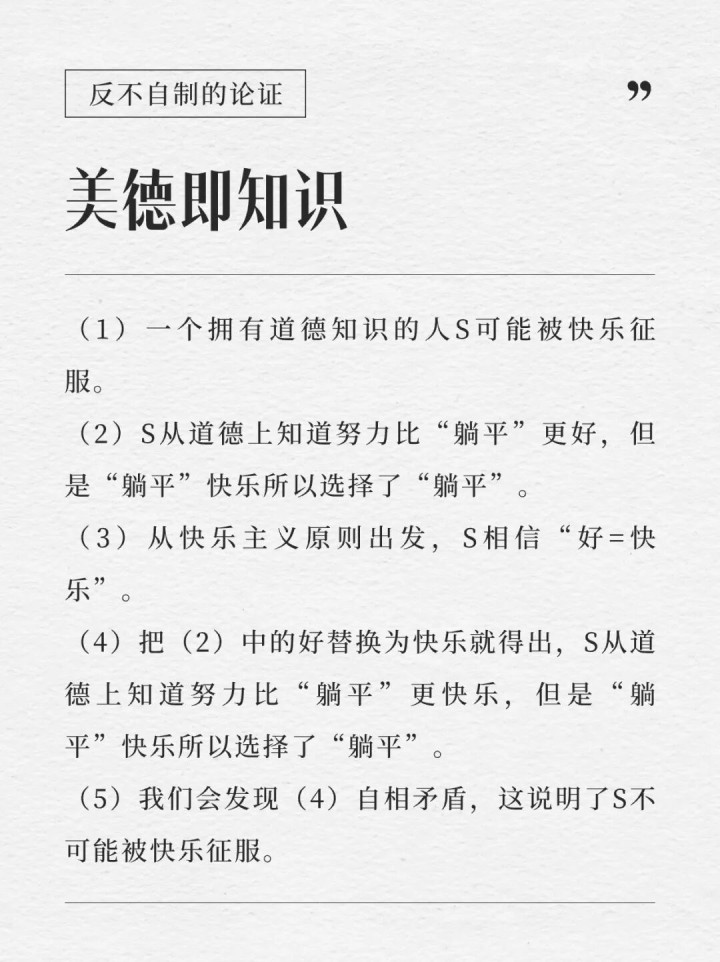 此外,苏格拉底还给出了一个省略而意旨酷好意旨酷好的论证,为了让这个论证看起来好剖析一些,咱们以书中提到的努力和“躺平”为例。