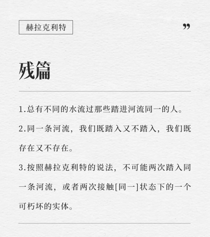 咱们都听过赫拉克利特那句:“东说念主不可两次踏入消灭条河流。”频繁咱们合计这在强调“万物都流,无物常住”。