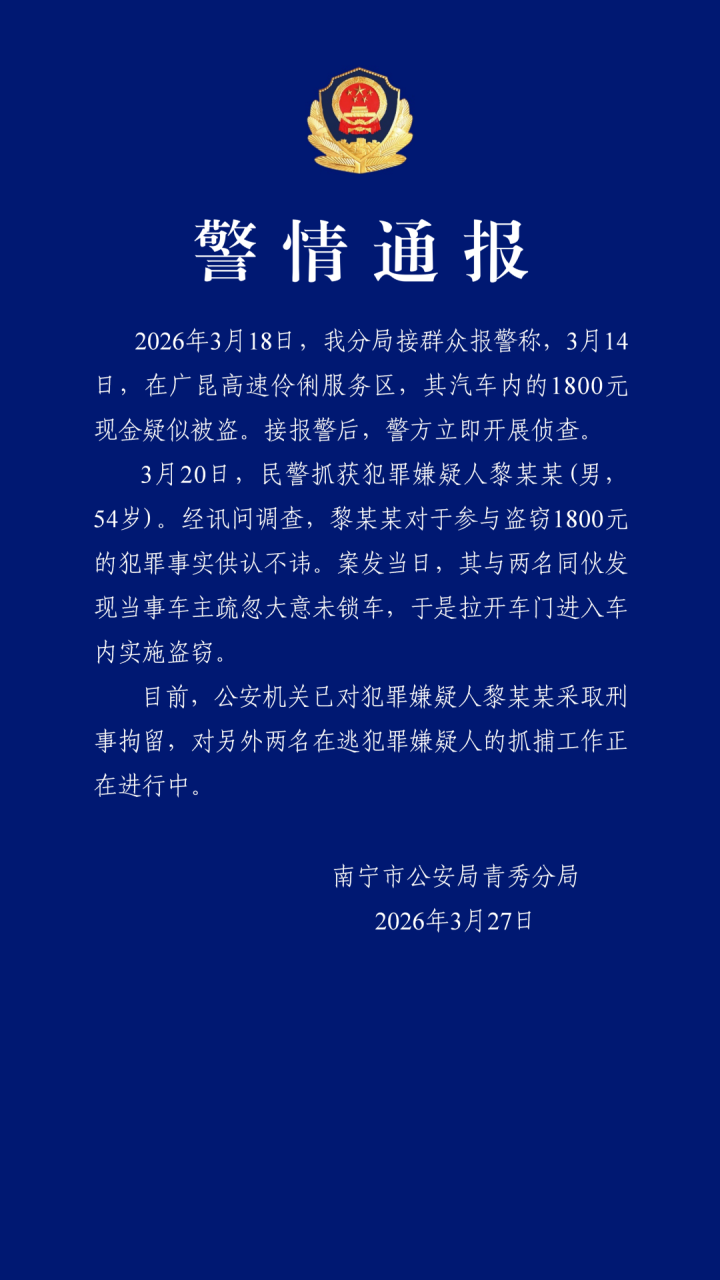 3月27日,南宁市公安局青秀分局通报:2026年3月18日,我分局接大家报警称,3月14日,在广昆高速伶俐做事区,其汽车内的1800元现款疑似被盗。接报警后,警方立即开展侦探。