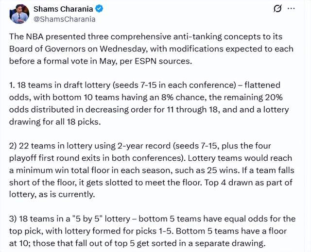 北京本领3月27日,据名记Shams报说念,ESPN音问源涌现,NBA已于昨日向定约理事会提交了三套全面的反摆烂改良有规划,预测每项有规划皆会在5月阐明投票前进行调度。
