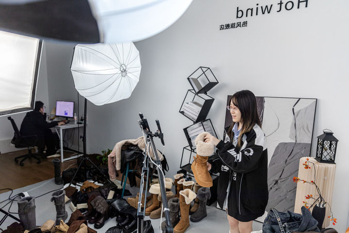 2025年11月10日,在浙江省温州市瓯海区的一家蚁合科技公司,主播通过蚁合直播销售鞋子。新华社发(刘祥瑞摄)