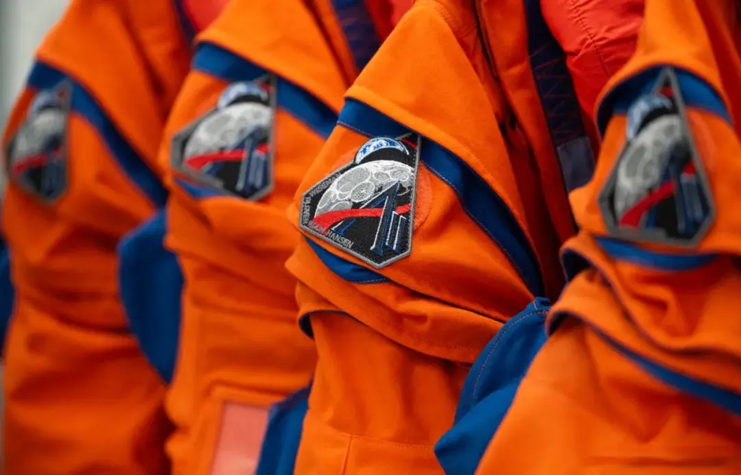 阿尔忒弥斯2号任务徽章贴在宇航员们的橙色航天服右肩上